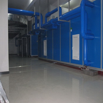 室內(nèi)空調(diào)機(jī)組由新回風(fēng)混合段、初效過濾器段、中效過濾器段、表冷器段或淋水段、加熱器段、加濕段、送風(fēng)機(jī)段、回風(fēng)機(jī)段、中間段和消聲段等各種功能段按需要隨意組合而成。>>AX系列空調(diào)機(jī)組各功能段及長度見表3.空調(diào)機(jī)組為板塊、骨架、組件發(fā)貨,由本公司專業(yè)人員到現(xiàn)場安裝。空調(diào)機(jī)組按其組合體的重量對地面的承重力有一定要求。各功能段的重量詳見其技術(shù)性能及尺寸表。4.空調(diào)機(jī)組的側(cè)壁板采用雙金屬夾心保溫彩色板,其厚度為50mm。5.空調(diào)機(jī)組的表冷器滴水盤采用厚3.0mm鋼板制作。滴水盤高100mm,并帶有排水水封,以保證排水暢通而又防止未經(jīng)處理的空氣進(jìn)入機(jī)組。淋水段內(nèi)表面襯有1.0mm厚的鍍鋅鋼板或0.75mm厚的不銹鋼板。6.空調(diào)機(jī)組分為左式和右式兩種(人面向空調(diào)機(jī)組的操作面,空氣在空調(diào)機(jī)組內(nèi)自右向左流動(dòng)稱為左式;自左向右流動(dòng)稱為右式)。7.空調(diào)機(jī)組檢修門規(guī)格為bxh=550x1200mm。開啟靈活,密封性能好,經(jīng)久耐用。8.空調(diào)機(jī)組的表冷器采用新型的?6銅管套二次翻邊波紋鋁片制成。片距為3.2mm,肋化系數(shù)為12.6。傳熱性能好,阻力小。表冷器的工作壓力為1.0MPa(10kg/cm2)。>>表冷器段的技術(shù)性能及其尺寸見表9.空調(diào)機(jī)組的加熱器有二種,即鋼管繞鋼片(鍍鋅)和銅管套鋁片。銅管加熱器工作壓力為0.6MPa(6kg/cm2),而鋼管加熱器工作壓力為1.0MPa(10kg/cm2)。為適應(yīng)我國南方地區(qū)無鍋爐房的用戶冬季利用本空調(diào)機(jī)組送熱風(fēng)之需要,本機(jī)組還可以配裝電加熱段。>>加熱器段的技術(shù)性能及其尺寸見表10.空調(diào)機(jī)組的初效過濾器為板式網(wǎng)狀過濾器,而中效過濾器則采用無紡布袋式過濾器,其效率高,阻力小,可反復(fù)洗滌多次使用。>>過濾段的技術(shù)性能及其尺寸見表11.空調(diào)機(jī)組加濕段采用DZS型(電動(dòng))、SZS型(手動(dòng))干蒸汽加濕器或濕膜加濕器。>>加濕量見表>>加濕段尺寸及新風(fēng)回風(fēng)混合段、新風(fēng)回風(fēng)排風(fēng)段、電加熱段、中間段、消聲段和均流閥段的尺寸見表12.空調(diào)機(jī)組的淋水段設(shè)有二排或三排噴淋排管,以適應(yīng)不同用戶之需要。>>淋水段技術(shù)性能及其尺寸見表13.空調(diào)機(jī)組風(fēng)機(jī)采用低噪聲4-79型標(biāo)準(zhǔn)風(fēng)機(jī)。送風(fēng)機(jī)段出風(fēng)方向有平吹和豎吹兩種。為用戶選用方便,本系列產(chǎn)品性能表中按送風(fēng)機(jī)風(fēng)壓大小列有低、中、高三檔??晒┑蛪侯^的降溫系統(tǒng)、中壓頭的恒溫恒濕系統(tǒng)和高壓頭的凈化系統(tǒng)選用。訂貨時(shí)需注明風(fēng)機(jī)性能和配用電機(jī)型號、功率。用戶也可另選其它型號風(fēng)機(jī)。>>送風(fēng)機(jī)段、回風(fēng)機(jī)段技術(shù)性能及其尺寸見表14.空調(diào)機(jī)組的風(fēng)閥采用對開式多葉調(diào)節(jié)閥。調(diào)節(jié)閥葉片角度調(diào)節(jié)準(zhǔn)確,開啟靈活。15.空調(diào)機(jī)組根據(jù)用途不同,可組裝成所需要的各種形式。本公司生產(chǎn)的空調(diào)機(jī)組的組合形式有28種之多。為用戶選用方便,我們將最常用的三種組合形式列出示例圖,供參考(舒適性空調(diào)機(jī)組、工藝性空調(diào)機(jī)組和凈化空調(diào)機(jī)組)。>>系列組合式空調(diào)機(jī)組常用的三種組合形式示例16.空調(diào)機(jī)組可配選雙共振腔微孔消聲器。其消聲量為15-20dB(A)。17.空調(diào)機(jī)組一般需設(shè)計(jì)建造混凝土基礎(chǔ)臺座,臺座高150-200mm。四周需作wxh=100x150mm的明溝,以排除空調(diào)機(jī)組冷、熱水管路、閥門及自控調(diào)節(jié)閥的滴水。18.空調(diào)機(jī)組均配有防水低壓照明燈。照明燈數(shù)量與檢修門數(shù)量相同。每只燈功率為60W,電壓為36V。19.我公司可為用戶制作各種非標(biāo)準(zhǔn)空調(diào)機(jī)組,并負(fù)責(zé)測試,達(dá)到設(shè)計(jì)要求。